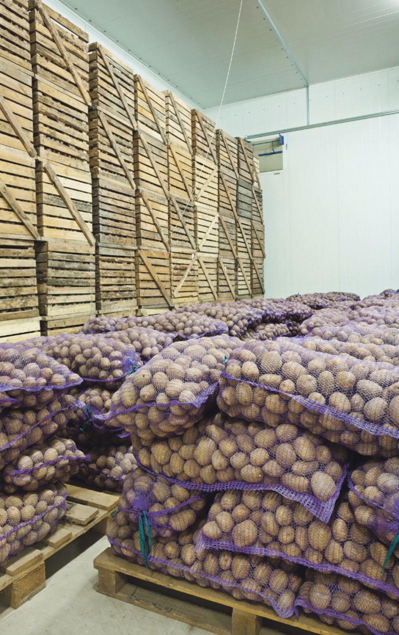 Најбољи начин чувања је у бокс палетама. За квалитетно чување кромпира веома је важно да се у складиште унесе здрав кромпир без механичких оштећења покожице као и са дозрелом покожицом. Као превентивна мера санирања рана препоручује се држање свеже извађеног кромпира једну до две недеље на температури 15-20°Ц и високој релативној влажности ваздуха. И поред спроведених мера заштите кртола у складишту се могу јавити болести непаразитне и паразитне природе.