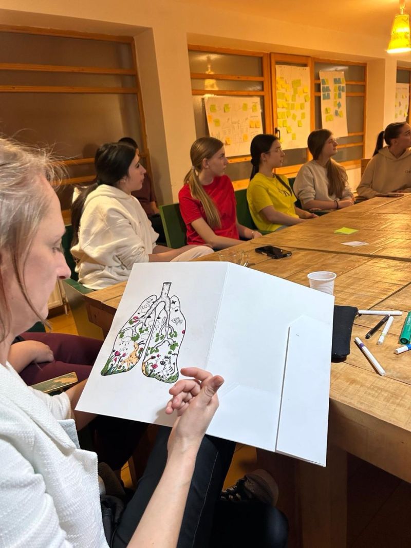 -То се догодило спонтано. Док смо разговарали о различитим проблемима на тему животне средине, дошла сам на идеју да урадим илустрацију и представим екосистем у плућима на метафоричан и симболичан начин. Узела сам фасцикле које смо понели као рекламни материјал да дамо предавачима и вођена инспирацијом почела да осликавам. Сама идеја и илустрација повезале су се у јасну, креативну и конкретну целину. Предавачима се то допало и предложили су нам да направимо визуелни идентиет пројекта на основу те илустрације, како би већи број људи могао да препозна ту проблематику- појашњава Ђурђевићева.