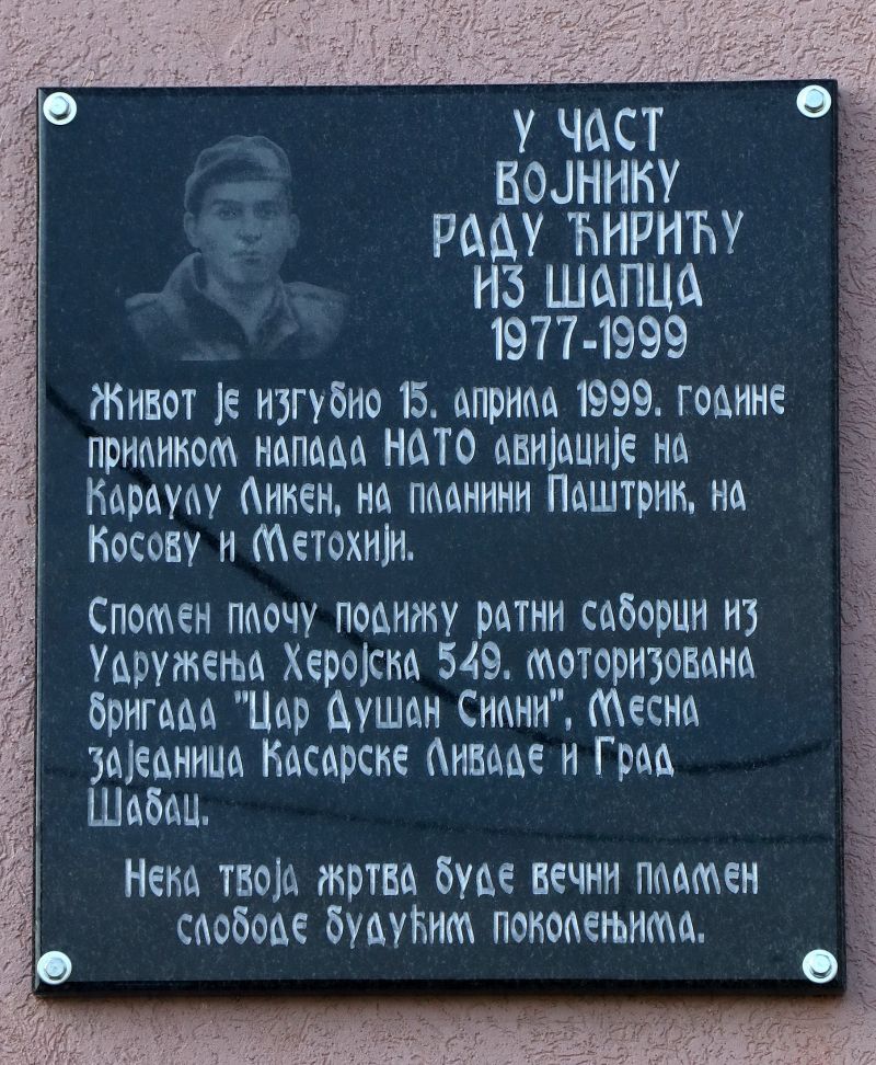 U naselju Kasarske livade u Šapcu, ispred Mesne zajednice, okupio se veliki broj meštana, saboraca, članova porodice, predstavnika lokalne samouprave, Vojske i Policije Srbije, kako bi se svečano otkrila spomen-ploča stradalom vojniku Radu Ćiriću (1977–1999), jednom od najmlađih branilaca koji su život izgubili na karauli Liken tokom NATO agresije 1999. godine. Spomen-ploču je postavilo Udruženje „Herojska 549. motorizovana brigada Car Dušan Silni“ uz podršku Grada Šapca.