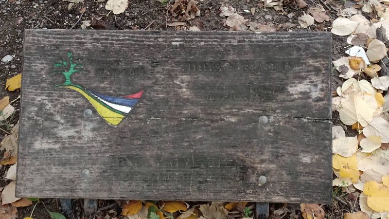 Ispod stabla postavljena je drvena tabla sa informacijama o zaštiti lipe, sa poprilično izbledelim slovima.